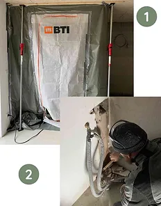 Im ersten Schritt wurde eine Abschottung errichtet. (1). Um die Schadstelle genau zu lokalisieren, musste die angrenzende Wand bis zur Betonfuge geöffnet werden (2).